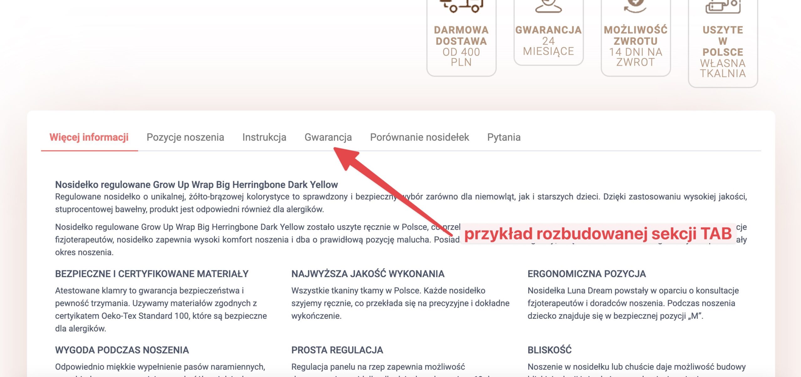 Dzięki dodatkowym zakładkom umieszczonym na karcie produktu będziesz w stanie umieścić więcej opisów podzielonych na kategorie np. wymienić opcje płatności i dostaw, umieścić załącznik z instrukcją czy inne treści.